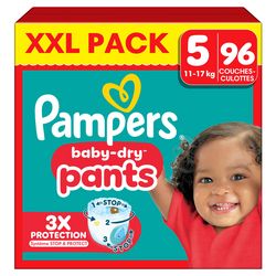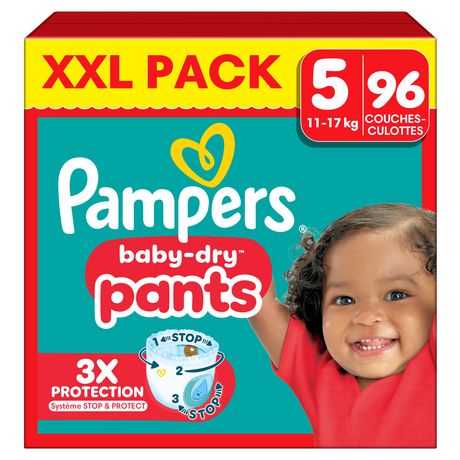 Lorsque votre bébé commence à bouger de plus en plus, il vous faut des couches-culottes qui suivent tous ses mouvements. Grâce à leur système Stop & Protect révolutionnaire, les couches-culottes Pampers Baby-Dry Pants offrent une protection intégrale supérieure contre les fuites, quelle que soit la position dans laquelle votre bout de chou se trouve, jour et nuit. Le système Stop & Protect de Pampers Baby-Dry Pants comprend : des barrières anti-fuites 2 x plus larges* qui aident à éviter les fuites au niveau des jambes, une poche qui aide à capturer les fuites à l'arrière, une ceinture flexible 360°, qui épouse les contours du corps de votre tout-petit quand il bouge et un cœur super absorbant offrant jusqu'à 12 heures de protection. Comme toutes nos couches-culottes, les couches-culottes Pampers Baby-Dry Pants sont faciles à changer même lorsque votre bébé gigote : faciles à enfiler en un seul geste, faciles à retirer en déchirant les côtés, et faciles à jeter en les enroulant grâce à la bande adhésive. Comme pour vous, la sécurité de votre bébé est notre priorité : Les couches-culottes Pampers Baby-Dry Pants sont approuvées dermatologiquement et contiennent 0% d'allergènes de parfum listés par l'UE (comme réglementé par la réglementation cosmétique de l'UE N°1223/2009). Elles sont approuvées par les dermatologues de la Skin Health Alliance et testées et certifiées Standard 100 par OEKO-TEX. Vous souhaitez en savoir plus sur la composition de nos produits Pampers ? Visitez pampers.fr. *par rapport à avant.