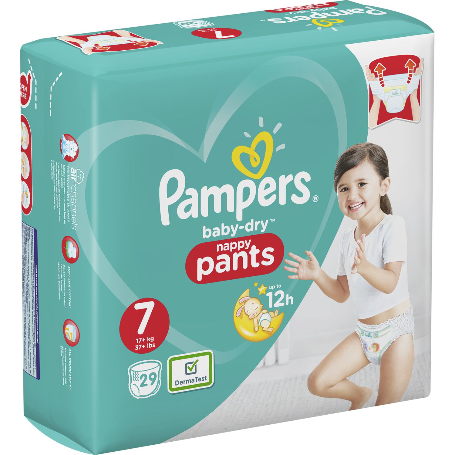 Pampers Baby-Dry Pants T7, 29 Couches-Culottes, Faciles À Enfiler Lorsque bébé commence à marcher à quatre pattes et à gigoter pendant le change, les couches peuvent être difficiles à mettre. Et si vous passiez aux couches-culottes Baby-Dry Pants. Les couches-culottes Pampers Baby-Dry Pants sont faciles à enfiler et à enlever en déchirant les côtés. La ceinture ultra-extensible permet à la couche-culotte de s’adapter aux mouvements de votre bébé pour lui offrir un confort et un ajustement optimal. Les canaux d’air permettent à l’air de circuler librement dans la couche-culotte. Ils gardent la peau de votre bébé bien au sec et la laissent respirer jusqu’à 12 heures. Dès que votre bébé marche à quatre pattes, le change devient simple et rapide avec les couches-culottes Pampers Baby-Dry Pants.