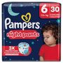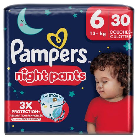 Offrez à votre bébé la meilleure protection Pampers pour la nuit avec les couches-culottes Pampers Night Pants : grâce à leur cœur absorbant elles sont le produit Pampers le plus absorbant pour une nuit jusqu'à 100% sans fuites. Elles sont également dotées d'une ceinture 360° qui s'adapte aux mouvements de votre bébé dans la nuit et d'une poche Stop & Protect qui aide à éviter les fuites à l'arrière de la couche-culotte. Comme toutes nos couches-culottes, les Pampers Night Pants sont faciles à changer : faciles à enfiler en un seul geste, faciles à retirer en déchirant les côtés, et faciles à jeter en les enroulant grâce à la bande adhésive. Comme pour vous, la sécurité de votre bébé est notre priorité : Les couches-culottes Pampers Night Pants sont approuvées dermatologiquement et contiennent 0% d'allergènes de parfum listés par l'UE (comme réglementé par la réglementation cosmétique de l'UE N° 1223/2009). Elles sont testées et certifiées Standard 100 par OEKO-TEX. Vous souhaitez en savoir plus sur la composition de nos produits ? Visitez pampers.fr