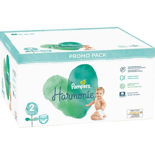 Les couches Pampers Harmonie respectent la peau délicate de votre bébé. Elles contiennent des matières d’origine végétale rigoureusement sélectionnées telles que du coton de haute qualité et de la cellulose. Elles garantissent 100 % d’absorption Pampers pour garder votre bébé jusqu’à 12 heures bien au sec. Conçues sans lotion, parfum, et sans les 26 allergènes listés par l’U.E, les couches Pampers Harmonie sont hypoallergéniques (conçues pour minimiser le risque d’allergies), testées dermatologiquement et certifiées par le label indépendant STANDARD 100 d’Oeko-Tex. La cellulose présente dans leur cœur absorbant est issue de forêts bien gérées certifiées FSC, et d’autres sources contrôlées. Pampers Harmonie Taille 2, 117 Couches, 4-8kg