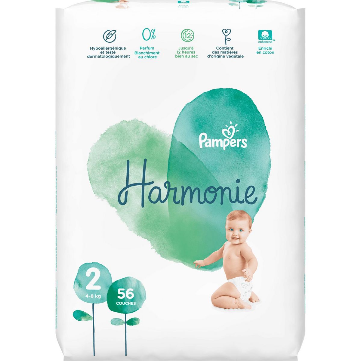 Les couches Pampers Harmonie aident à protéger la peau de votre bébé. Elles sont conçues à base de coton de haute qualité, de fibres douces d’origine végétale, et d’autres composants soigneusement sélectionnés. Sans parfum, blanchiment au chlore, ni latex, elles garantissent 100 % l’absorption Pampers pour que votre bébé soit bien au sec. Elles sont hypoallergéniques et testées dermatologiquement pour la peau délicate de votre bébé. Parce que votre bébé mérite des soins doux pour sa peau et ce, sans compromis, les couches Pampers Harmonie garantissent jusqu’à 12 heures bien au sec. Elles arborent d’adorables imprimés et sont dotées d’un indicateur d’urine Pampers très pratique : vous et votre enfant allez les adorer. De plus, les couches Pampers Harmonie sont conçues à partir d’énergie 100 % renouvelable et leur cœur absorbant est composé de cellulose issue de sources gérées de façon responsable. Pampers Harmonie Taille 2, 56 Couches, 4-8 kg