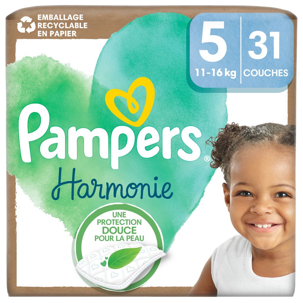 Protection douce pour la peau avec 100% d'absorption Pampers. Les couches Pampers Harmonie sont douces pour la peau de bébé ; elles sont hypoallergéniques¹, approuvées dermatologiquement, contiennent 0% de parfum et de lotion, sont certifiées Standard 100 par OEKO-TEX et approuvées par les dermatologues de la Skin Health Alliance². Elles sont fabriquées avec de la cellulose certifiée FSC et d'autres matières soigneusement sélectionnées. Elles garantissent jusqu'à 12 h de protection Pampers, pour que chaque parent soit rassuré de la qualité Pampers. Les couches Pampers Harmonie arborent de nouveaux motifs trop mignons et sont dotées d'un indicateur d'humidité Pampers très pratique : vous et votre bébé allez les adorer ! Vous souhaitez en savoir plus sur la composition des produits Pampers ? Visitez pampers.fr. ¹Conçues pour minimiser le risque de réactions allergiques. ²La SHA approuve les couches Pampers comme étant sans danger au contact de la peau de bébé. Pour en savoir plus, visitez pampers.fr