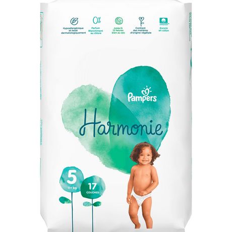 Pampers Harmonie Taille 5, 17 Couches, 11kg+ Les couches Pampers Harmonie respectent la peau délicate de votre bébé. Elles contiennent des matières d’origine végétale rigoureusement sélectionnées telles que du coton de haute qualité et de la cellulose. Elles garantissent 100 % d’absorption Pampers pour garder votre bébé jusqu’à 12 heures bien au sec. Conçues sans lotion, parfum, et sans les 26 allergènes listés par l’U.E, les couches Pampers Harmonie sont hypoallergéniques (conçues pour minimiser le risque d’allergies), testées dermatologiquement et certifiées par le label indépendant STANDARD 100 d’Oeko-Tex. La cellulose présente dans leur cœur absorbant est issue de forêts bien gérées certifiées FSC, et d’autres sources contrôlées.