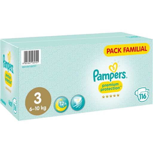 Offrez une protection imbattable à la peau de votre bébé. Les couches sont tellement douces et confortables que votre bébé les sentira à peine. Nos 3 canaux absorbants sont spécialement conçus pour aider à répartir l’humidité uniformément pour garantir notre meilleure absorption. Le voile absorbant unique tient l’humidité et les selles molles éloignées de la peau délicate de votre bébé. L’indicateur d’urine devient bleu pour vous signaler que votre bébé a fait pipi. Les attaches extensibles ultra-douces des couches Premium Protection aident la couche à rester bien en place en s’adaptant à tous les mouvements de votre bébé. Pampers Premium Protection Taille 3, 6-10 kg, 116 Couches