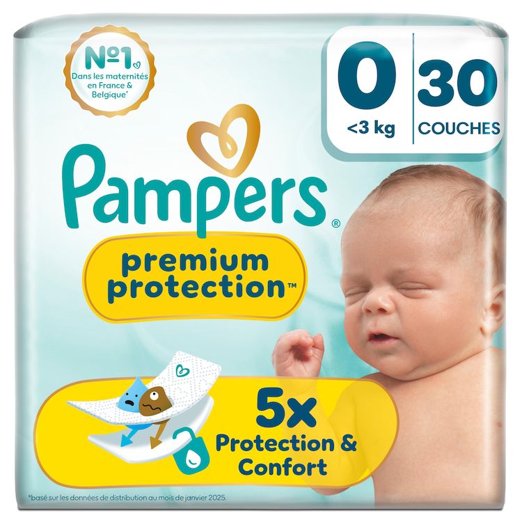 DOUBLE PROTECTION : pour la peau et contre les fuites. Le meilleur confort et protection Pampers pour les peaux sensibles - testé et approuvé par les bébés ! Nous avons conçu la couche Pampers N°1 spécialement pour la peau délicate des nouveau-nés. C'est également notre N°1 contre les fuites. Les couches Pampers Premium Protection offrent notre meilleure protection, grâce à : 1) une ABSORPTION INSTANTANÉE - avec plus de 1000 micro-alvéoles absorbantes qui éloignent instantanément l'humidité et les selles molles de la peau pour la garder bien au sec et protégée. 2) des MATIÈRES ULTRA-DOUCES pour envelopper votre bébé dans un nuage de confort et de protection. Et 3) notre MAINTIEN CONFORTABLE avec un système d'attaches superposables et une forme adaptée au nombril. Les couches Pampers Premium Protection, le choix N° 1 des maternités en France, sont 100 % sûres pour la peau de votre bébé : elles sont testées dermatologiquement, approuvées par les dermatologues de Skin Health Alliance et ne contiennent aucun des allergènes de parfums listés par l'UE (comme réglementé par la réglementation cosmétique de l'UE N°1223/2009). Pas étonnant que les nouveau-nés les approuvent !