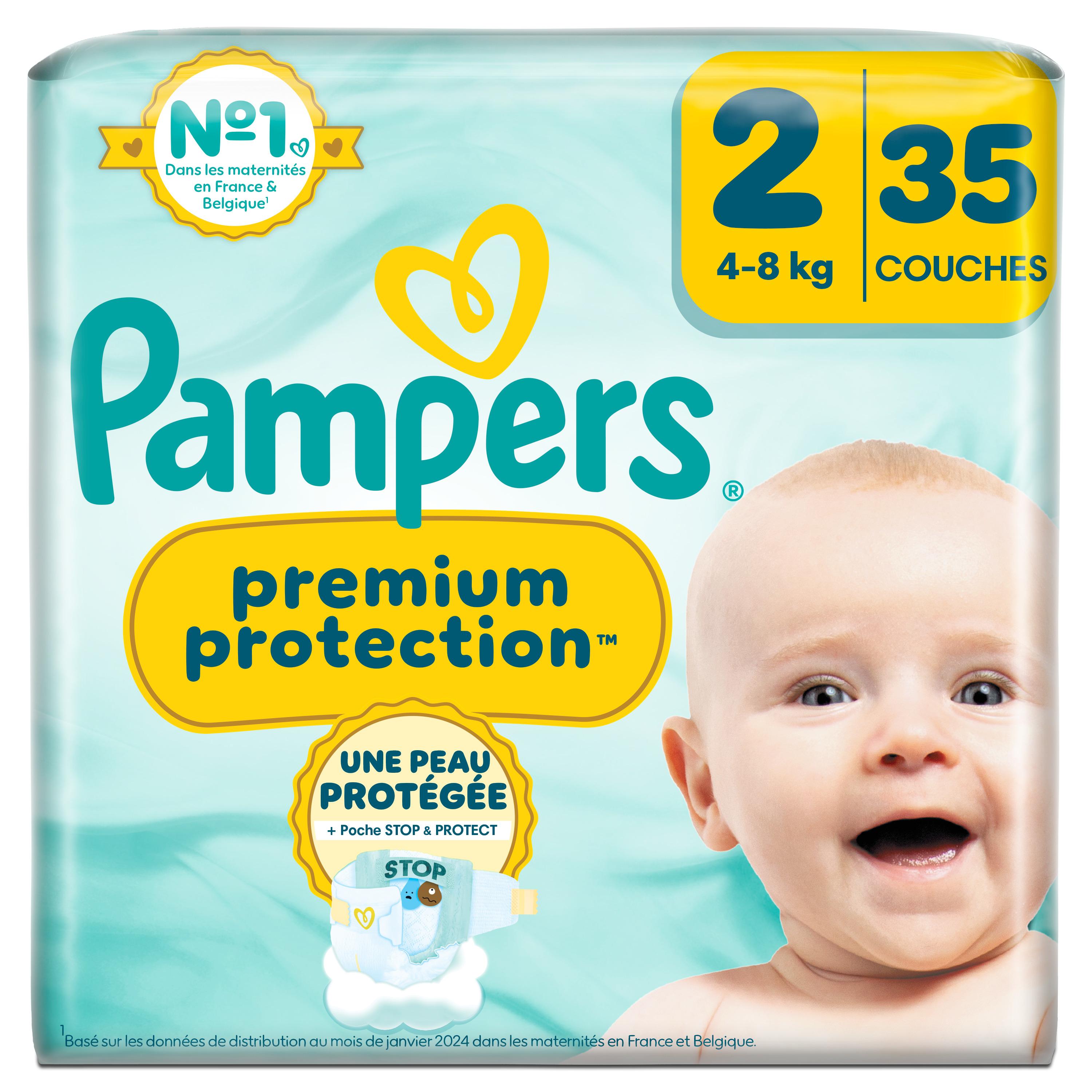 DOUBLE PROTECTION : pour la peau et contre les fuites. Les couches Pampers N°1 pour le confort et la protection des peaux sensibles - testées et approuvées par des bébés. Nous avons conçu la couche Pampers N°1 spécialement pour la peau délicate des nouveau-nés. C'est également notre couche N°1 contre les fuites. Les couches Pampers Premium Protection offrent notre meilleure protection, grâce à 1) une ABSORPTION INSTANTANÉE, avec plus de 1 000 micro-alvéoles absorbantes qui éloignent instantanément l'humidité et les selles molles de la peau et les capturent au cœur de la couche, pour protéger la peau et la garder bien au sec. 2) POCHE UNIQUE STOP & PROTECT pour capturer les fuites à l'arrière de la couche. 3) Des MATIÈRES ULTRA-DOUCES pour envelopper votre bébé dans un nuage de confort et de protection. Et 4) notre technologie unique Comfort Fit avec un système d'attaches superposables et une découpe spéciale cordon ombilical. Les couches Pampers Premium Protection, le choix N°1 des maternités en France*, sont 100% sûres pour la peau de votre bébé. Elles sont testées dermatologiquement et ne contiennent aucun des allergènes de parfum listés par l'UE (comme réglementé par la réglementation cosmétique de l'UE N°1223/2009). Pas étonnant que les nouveau-nés approuvent.