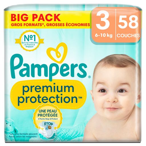 Double protection : pour la peau et contre les fuites. Les couches Pampers N°1 pour le confort et la protection des peaux sensibles - testées et approuvées par les bébés ! Nous avons conçu la couche Pampers N°1 spécialement pour la peau délicate des nouveau-nés. C'est également notre couche N°1 contre les fuites. Les couches Pampers Premium Protection offrent notre meilleure protection, grâce à 1) une absorption instantanée, avec des millions de micro-alvéoles absorbantes qui éloignent instantanément l'humidité et les selles molles de la peau et les capturent au cœur de la couche afin de garder la peau délicate de votre bébé bien au sec et protégée. 2) Une poche Stop & Protect unique pour capturer les fuites à l'arrière de la couche. 3) Des matières ultra-douces pour envelopper votre bébé dans un nuage de confort et de protection. Et 4) notre technologie unique Comfort Fit avec un système d'attaches superposables et une découpe spéciale cordon ombilical. Les couches Pampers Premium Protection, le choix N°1 des maternités en France*, sont 100 % sûres pour la peau de votre bébé. Elles sont testées dermatologiquement et ne contiennent aucun des allergènes de parfum listés par l'UE (comme réglementé par la réglementation cosmétique de l'UE N°1223/2009). Pas étonnant que les nouveau-nés approuvent ! *Basé sur les données de distribution sur les tailles 0 & 1 au mois de janvier 2024 dans les maternités en France