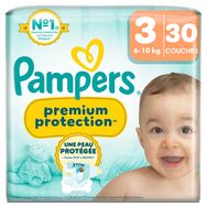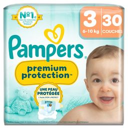 DOUBLE PROTECTION : pour la peau et contre les fuites. Les couches Pampers N°1 pour le confort et la protection des peaux sensibles - testées et approuvées par des bébés. Nous avons conçu la couche Pampers N°1 spécialement pour la peau délicate des nouveau-nés. C'est également notre couche N°1 contre les fuites. Les couches Pampers Premium Protection offrent notre meilleure protection, grâce à 1) une ABSORPTION INSTANTANÉE, avec plus de 1 000 micro-alvéoles absorbantes qui éloignent instantanément l'humidité et les selles molles de la peau et les capturent au cœur de la couche, pour protéger la peau et la garder bien au sec. 2) POCHE UNIQUE STOP & PROTECT pour capturer les fuites à l'arrière de la couche. 3) Des MATIÈRES ULTRA-DOUCES pour envelopper votre bébé dans un nuage de confort et de protection. Et 4) notre technologie unique COMFORT FIT avec un système d'attaches superposables. Les couches Pampers Premium Protection, le choix N°1 des maternités en France*, sont 100% sûres pour la peau de votre bébé. Elles sont testées dermatologiquement et ne contiennent aucun des allergènes de parfum listés par l'UE (comme réglementé par la réglementation cosmétique de l'UE N°1223/2009). Pas étonnant que les bébés approuvent.