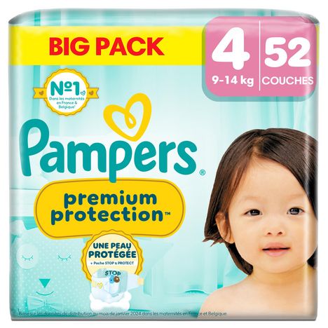 DOUBLE PROTECTION : pour la peau et contre les fuites. Les couches Pampers N°1 pour le confort et la protection des peaux sensibles - testées et approuvées par des bébés. Nous avons conçu la couche Pampers N°1 spécialement pour la peau délicate des nouveau-nés. C'est également notre couche N°1 contre les fuites. Les couches Pampers Premium Protection offrent notre meilleure protection, grâce à 1) une ABSORPTION INSTANTANÉE, avec plus de 1 000 micro-alvéoles absorbantes qui éloignent instantanément l'humidité et les selles molles de la peau et les capturent au cœur de la couche, pour protéger la peau et la garder bien au sec. 2) POCHE UNIQUE STOP & PROTECT pour capturer les fuites à l'arrière de la couche. 3) Des MATIÈRES ULTRA-DOUCES pour envelopper votre bébé dans un nuage de confort et de protection. Et 4) notre technologie unique COMFORT FIT avec un système d'attaches superposables. Les couches Pampers Premium Protection, le choix N°1 des maternités en France*, sont 100% sûres pour la peau de votre bébé. Elles sont testées dermatologiquement et ne contiennent aucun des allergènes de parfum listés par l'UE (comme réglementé par la réglementation cosmétique de l'UE N°1223/2009). Pas étonnant que les bébés approuvent.