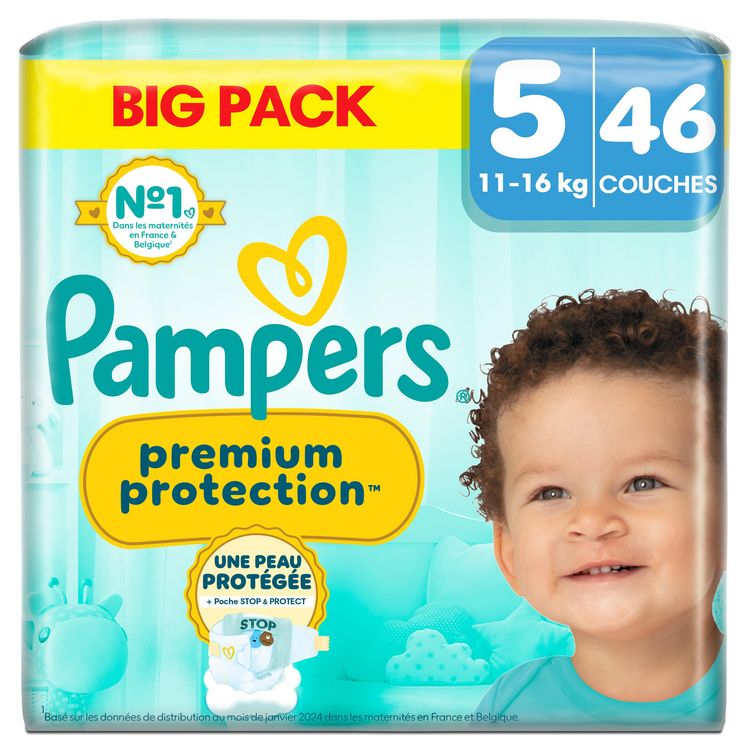 DOUBLE PROTECTION : pour la peau et contre les fuites. Les couches Pampers N°1 pour le confort et la protection des peaux sensibles - testées et approuvées par des bébés. Nous avons conçu la couche Pampers N°1 spécialement pour la peau délicate des nouveau-nés. C'est également notre couche N°1 contre les fuites. Les couches Pampers Premium Protection offrent notre meilleure protection, grâce à 1) une ABSORPTION INSTANTANÉE, avec plus de 1 000 micro-alvéoles absorbantes qui éloignent instantanément l'humidité et les selles molles de la peau et les capturent au cœur de la couche, pour protéger la peau et la garder bien au sec. 2) POCHE UNIQUE STOP & PROTECT pour capturer les fuites à l'arrière de la couche. 3) Des MATIÈRES ULTRA-DOUCES pour envelopper votre bébé dans un nuage de confort et de protection. Et 4) notre technologie unique COMFORT FIT avec un système d'attaches superposables. Les couches Pampers Premium Protection, le choix N°1 des maternités en France*, sont 100% sûres pour la peau de votre bébé. Elles sont testées dermatologiquement et ne contiennent aucun des allergènes de parfum listés par l'UE (comme réglementé par la réglementation cosmétique de l'UE N°1223/2009). Pas étonnant que les bébés approuvent.