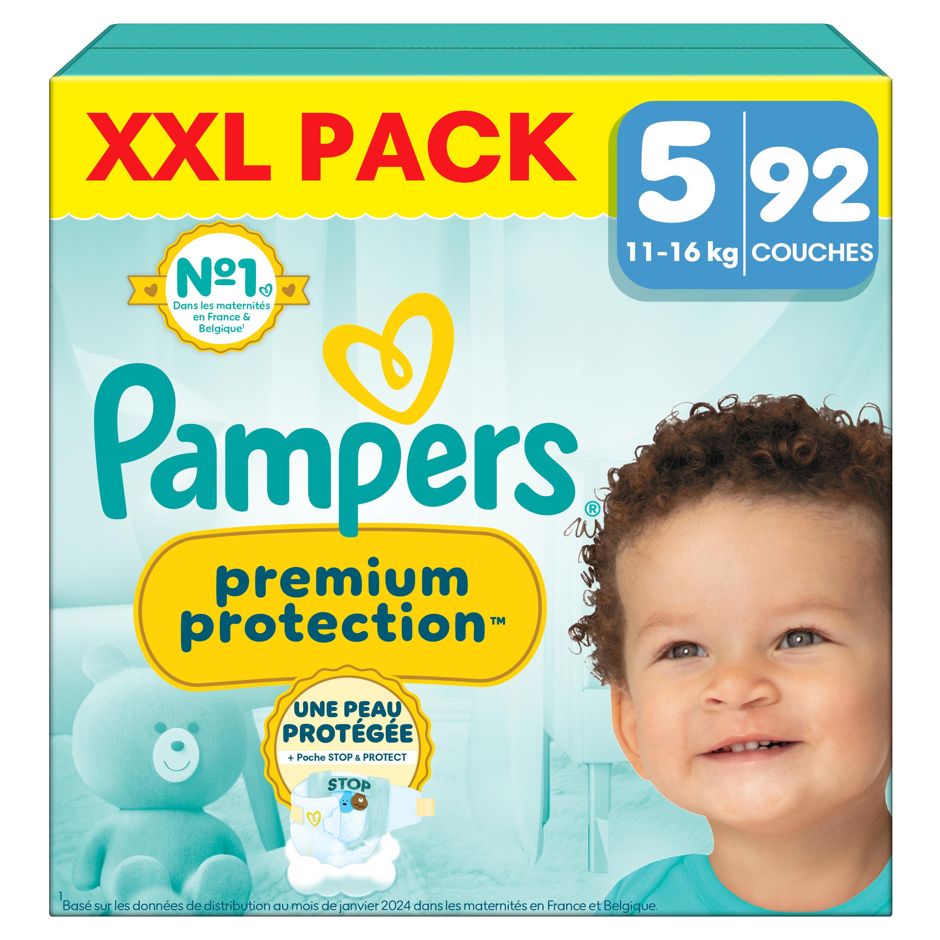 DOUBLE PROTECTION : pour la peau et contre les fuites. Les couches Pampers N°1 pour le confort et la protection des peaux sensibles - testées et approuvées par des bébés. Nous avons conçu la couche Pampers N°1 spécialement pour la peau délicate des nouveau-nés. C'est également notre couche N°1 contre les fuites. Les couches Pampers Premium Protection offrent notre meilleure protection, grâce à 1) une ABSORPTION INSTANTANÉE, avec plus de 1 000 micro-alvéoles absorbantes qui éloignent instantanément l'humidité et les selles molles de la peau et les capturent au cœur de la couche, pour protéger la peau et la garder bien au sec. 2) POCHE UNIQUE STOP & PROTECT pour capturer les fuites à l'arrière de la couche. 3) Des MATIÈRES ULTRA-DOUCES pour envelopper votre bébé dans un nuage de confort et de protection. Et 4) notre technologie unique COMFORT FIT avec un système d'attaches superposables. Les couches Pampers Premium Protection, le choix N°1 des maternités en France*, sont 100% sûres pour la peau de votre bébé. Elles sont testées dermatologiquement et ne contiennent aucun des allergènes de parfum listés par l'UE (comme réglementé par la réglementation cosmétique de l'UE N°1223/2009). Pas étonnant que les bébés approuvent.