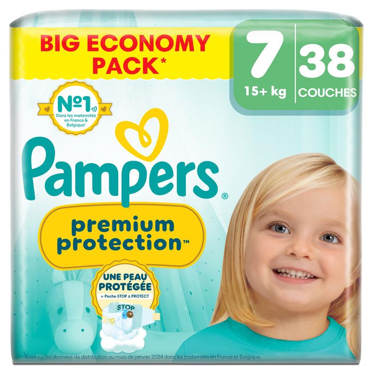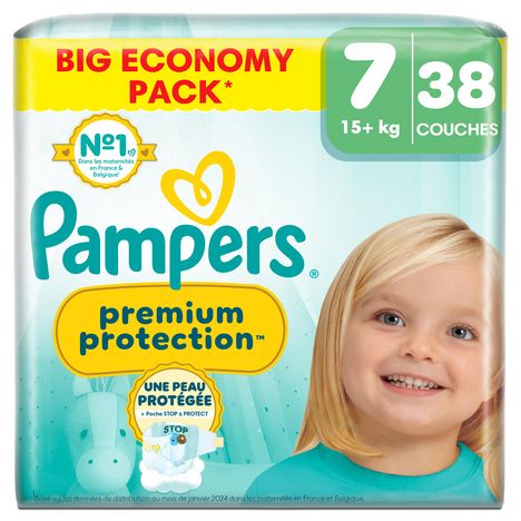 DOUBLE PROTECTION : pour la peau et contre les fuites. Les couches Pampers N°1 pour le confort et la protection des peaux sensibles - testées et approuvées par des bébés. Nous avons conçu la couche Pampers N°1 spécialement pour la peau délicate des nouveau-nés. C'est également notre couche N°1 contre les fuites. Les couches Pampers Premium Protection offrent notre meilleure protection, grâce à 1) une ABSORPTION INSTANTANÉE, avec plus de 1 000 micro-alvéoles absorbantes qui éloignent instantanément l'humidité et les selles molles de la peau et les capturent au cœur de la couche, pour protéger la peau et la garder bien au sec. 2) POCHE UNIQUE STOP & PROTECT pour capturer les fuites à l'arrière de la couche. 3) Des MATIÈRES ULTRA-DOUCES pour envelopper votre bébé dans un nuage de confort et de protection. Et 4) notre technologie unique COMFORT FIT avec un système d'attaches superposables. Les couches Pampers Premium Protection, le choix N°1 des maternités en France*, sont 100% sûres pour la peau de votre bébé. Elles sont testées dermatologiquement et ne contiennent aucun des allergènes de parfum listés par l'UE (comme réglementé par la réglementation cosmétique de l'UE N°1223/2009). Pas étonnant que les bébés approuvent.
