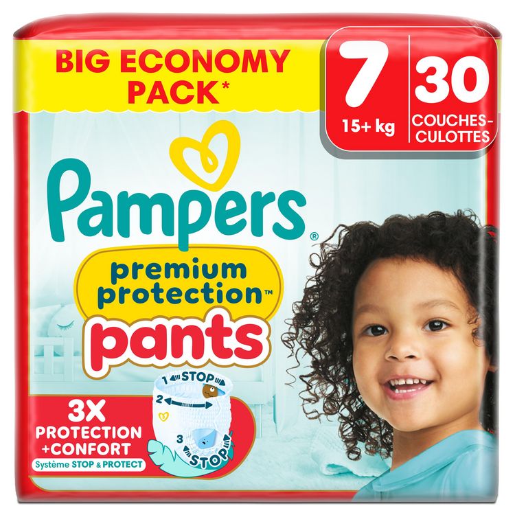 Lorsque votre bébé devient plus actif, il vous faut des couches-culottes qui offrent une protection fiable et un ajustement optimal qui suit tous ses mouvements. Offrez à votre bébé le meilleur confort Pampers et la meilleure protection contre les fuites avec les couches-culottes Pampers Premium Protection Pants : leurs barrières anti-fuites douces sont 2 x plus larges et protègent contre les marques rouges et les fuites. Leur ceinture ultra-douce 360° s'adapte à la morphologie de votre bébé lorsqu'il gigote et explore le monde, et leur poche unique Stop & Protect aide à éviter les fuites à l'arrière. Comme toutes nos couches-culottes, Pampers Premium Protection Pants sont faciles à changer : faciles à enfiler en un seul geste, faciles à retirer en déchirant les côtés, et faciles à jeter en les enroulant grâce à la bande adhésive. Comme pour vous, la sécurité de votre bébé est notre priorité : Les couches-culottes Pampers Premium Protection sont approuvées dermatologiquement et contiennent 0% d'allergènes de parfum listés par l'UE (comme règlementé par la réglementation cosmétique de l'UE N°1223/2009). Elles sont approuvées par les dermatologues de la Skin Health Alliance et testées et certifiées Standard 100 par OEKO-TEX. Vous souhaitez en savoir plus sur la composition de nos produits Pampers ? Visitez pampers.fr. * par rapport à avant.