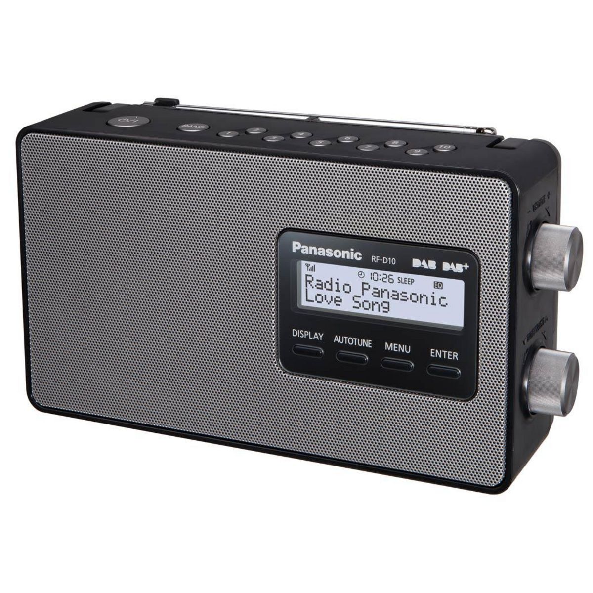 Panasonic RFD10EGK Radio portable Panasonic RFD10EGK. Radio portable compatible DAB/DAB+, FM. Dotée d'un écran LCD avec rétroéclairage blanc, horloge et fonctions Timer et Sleep.