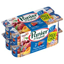 Panier de Yoplait 0%, c’est un dessert onctueux et des bons fruits, avec 0% de matière grasse. Panier de Yoplait c’est : • 100% de lait de nos régions • 100% de morceaux de fruits mis en œuvre dans nos recettes • 100% de notre production provient de nos laiteries du Mans ou de Vienne • Sans conservateur, ni colorant et arômes artificiels Notre engagement ne s’arrête pas là. Nous nous efforçons à réduire notre empreinte carbone en : •Réduisant le plastique de 13% sur nos pots depuis 10 ans •Utilisant que du carton 100% recyclé Yaourt 0% mat.gr., aux fruits, aromatisé, avec édulcorants
