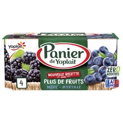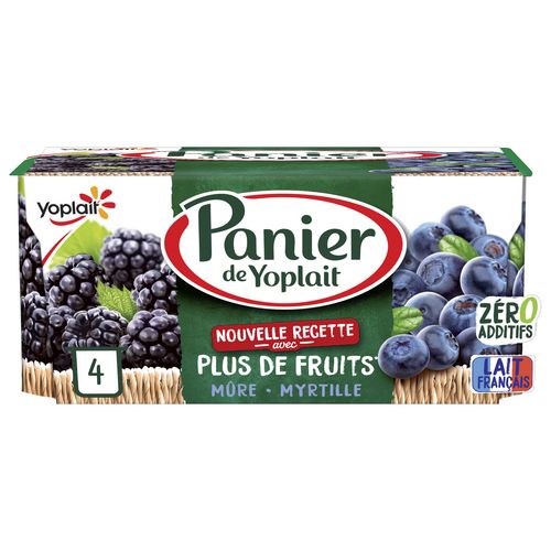 Découvrez les yaourts aux fruits Panier de Yoplait : 4 yaourts aux fruits rouges avec 2 parfums différents (mûre et myrtille). Nous avons élaboré une nouvelle recette avec plus de fruits et zéro additifs pour vous offrir un yaourt avec de délicieux morceaux de fruits et du lait 100 % français. Panier de Yoplait, c’est l'alliance gourmande de bons fruits et d'un yaourt onctueux pour un maximum de plaisir à partager en famille. Retrouvez tout le savoir-faire de Yoplait et le bon goût du fruit avec la gamme Panier de Yoplait. Yoplait, goûtons la vie du bon côté ! *la coloration est apportée par des jus de fruits ou légumes