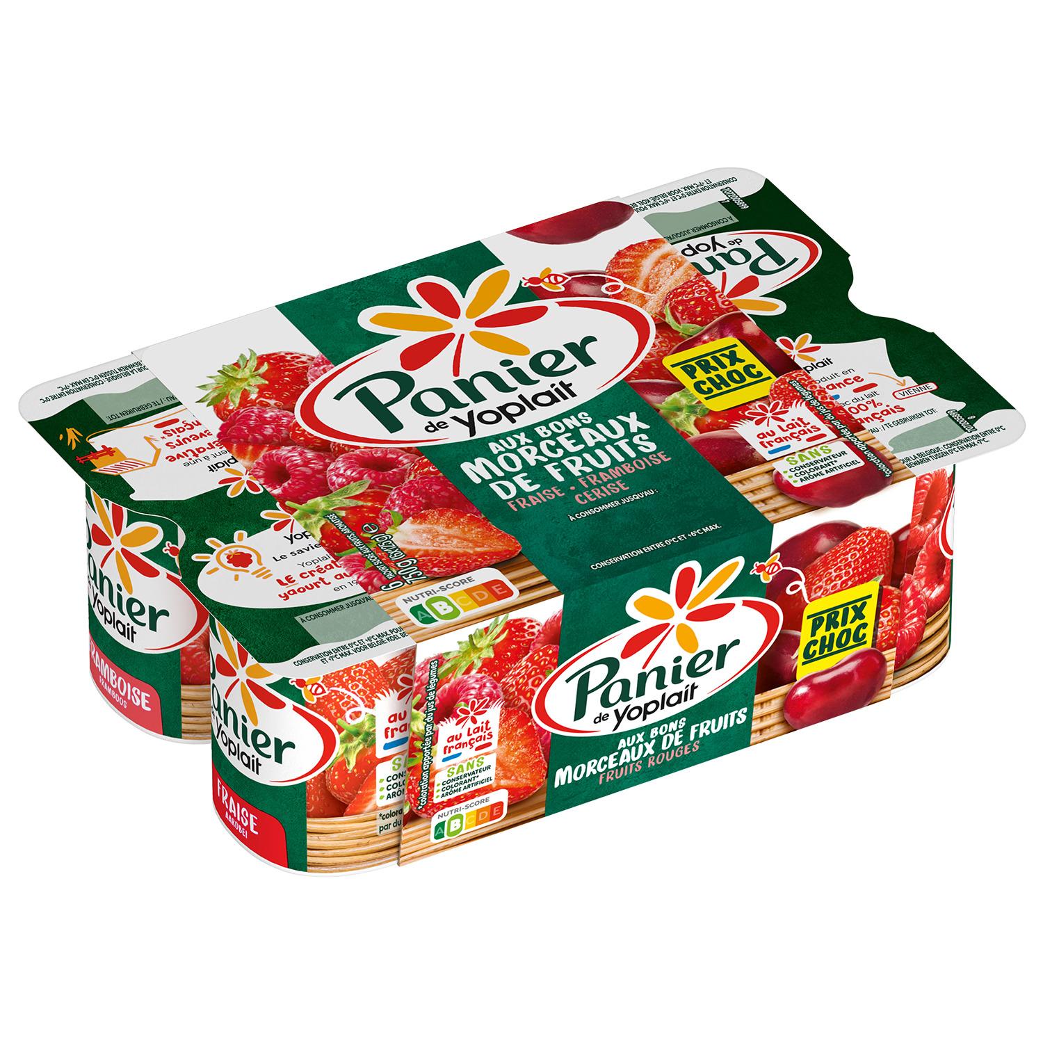 Découvrez les yaourts aux fruits Panier de Yoplait : 6 yaourts aux fruits rouges (fraise, cerise, framboise). Nous avons élaboré une nouvelle recette avec plus de fruits et zéro additifs pour vous offrir un yaourt avec de délicieux morceaux de fruits et du lait 100 % français. Panier de Yoplait, c'est l'alliance gourmande de bons fruits et d'un yaourt onctueux pour un maximum de plaisir à partager en famille. Retrouvez tout le savoir-faire de Yoplait et le bon goût du fruit avec la gamme Panier de Yoplait. Yoplait, goûtons la vie du bon côté ! *la coloration est apportée par des jus de légumes