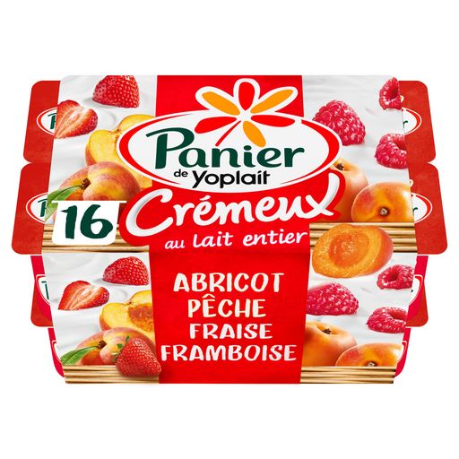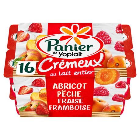 Panier de Yoplait Le Crémeux, c'est l'alliance gourmande de bons morceaux de fruits et d'un yaourt crémeux au lait entier! Panier de Yoplait Le Crémeux c'est : • 100% de lait de nos régions • 100% de notre production provient de nos laiteries du Mans ou de Vienne • Aux bons morceaux de fruits • Sans conservateur, ni colorant et arôme artificiel