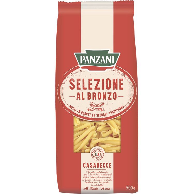 Panzani Selezione Al Bronzo sont des pâtes d’exception fabriquées dans le sud de l’Italie selon la méthode traditionnelle italienne. Ce procédé spécifique de fabrication dans des moules en bronze ainsi qu’un séchage lent inspiré du savoir-faire artisanal garantissent une pâte de qualité supérieure à la texture authentique et gourmande. Pâtes alimentaires de qualité supérieure