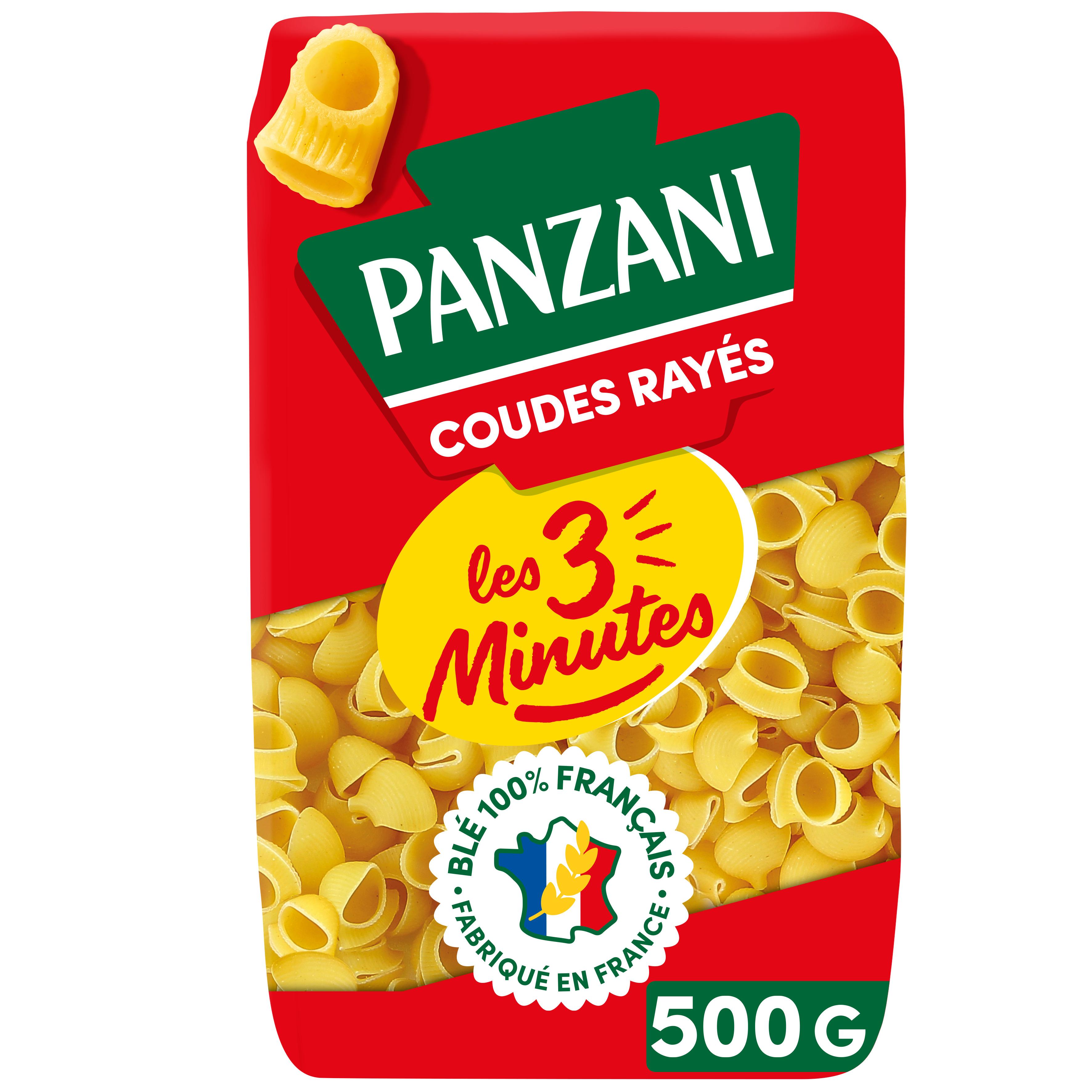 Nos coudes rayés 3 minutes Panzani c'est tout le plaisir et la qualité des pâtes Panzani au blé 100% français, prêtes en seulement 3 minutes grâce à une pâte plus fine qui permet une cuisson plus rapide, tout naturellement. Elles sont fabriquées avec amour dans nos usines de pâtes de Marseille et Nanterre.