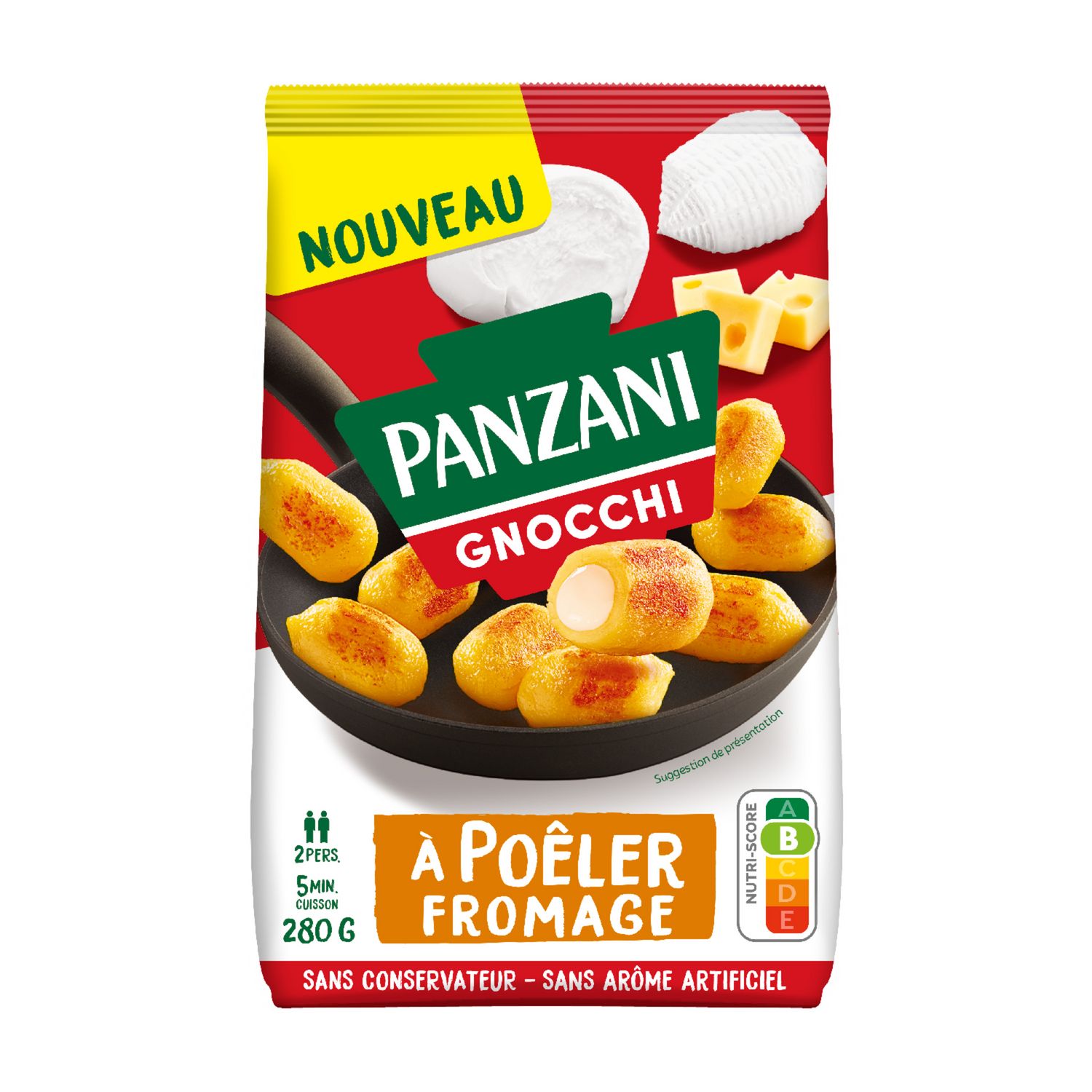 Ingrédients : flocons de pomme de terre réhydratés 51% (eau, flocons de pomme de terre déshydratés 15%), semoule de BLÉ dur 16%, fécule de pomme de terre, MOZZARELLA (LAIT) 9,2%, EMMENTAL (LAIT) 4,4%, RICOTTA (LAIT) 3,7%, eau, huile de tournesol, sel, arômes naturels (LAIT, ORGE), curcuma. Peut contenir des traces de soja, moutarde et oeuf. Conditionné sous atmosphère protectrice. Produit à consommer cuit. Ne convient pas pour une cuisson au micro-ondes.Un léger dépôt d'huile peut se former en fond de sachet.