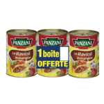 Ingrédients : Eau, ravioli (semoule de BLE dur, eau, viande de bœuf, chapelure (farine de BLE, sel, levure), carottes 0,7%, sel, oignons déshydratés), viande de porc, triple concentré de tomate 6%, oignons, vin blanc, carottes 1% , viande de boeuf, sel, persil, huile d’olive vierge extra 0,2%, sucre, arômes, ail, amidon modifié de maïs.Viandes de bœuf et de porc mises en oeuvre: 15% du poids net total.Viande de boeuf origine FranceViande de porc origine Union Européenne.