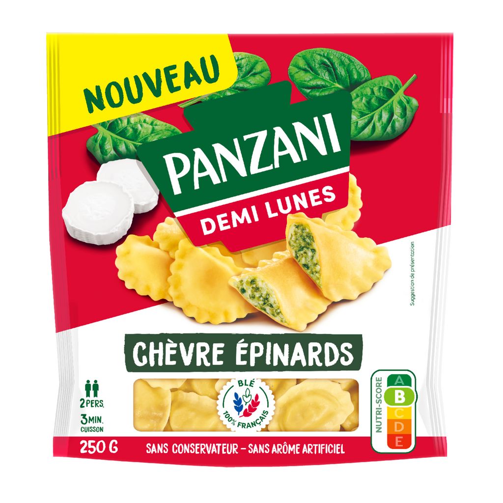 Ingrédients : Pâte 50% (semoule de BLÉ dur 37%, eau, OEUFS 5,2%), farce 50% (épinards 17%, chapelure (farine de BLÉ tendre, eau, sel), FROMAGE DE CHÈVRE FONDU 5% (FROMAGE DE CHÈVRE (LAIT) 4%, eau), RICOTTA (LAIT), eau, huile de tournesol, perméat de LACTOSERUM (LAIT), FROMAGE FRAIS (LAIT), arômes naturels (LAIT), sel, ail, fibres de bambou et graines de psyllium, noix de muscade, poivre).Peut contenir des traces de moutarde, soja, céleri, sésame, crustacé, poisson, pistache, noix et amande.Conditionné sous atmosphère protectrice. Produit à consommer cuit. Ne convient pas pour une cuisson au micro-ondes.