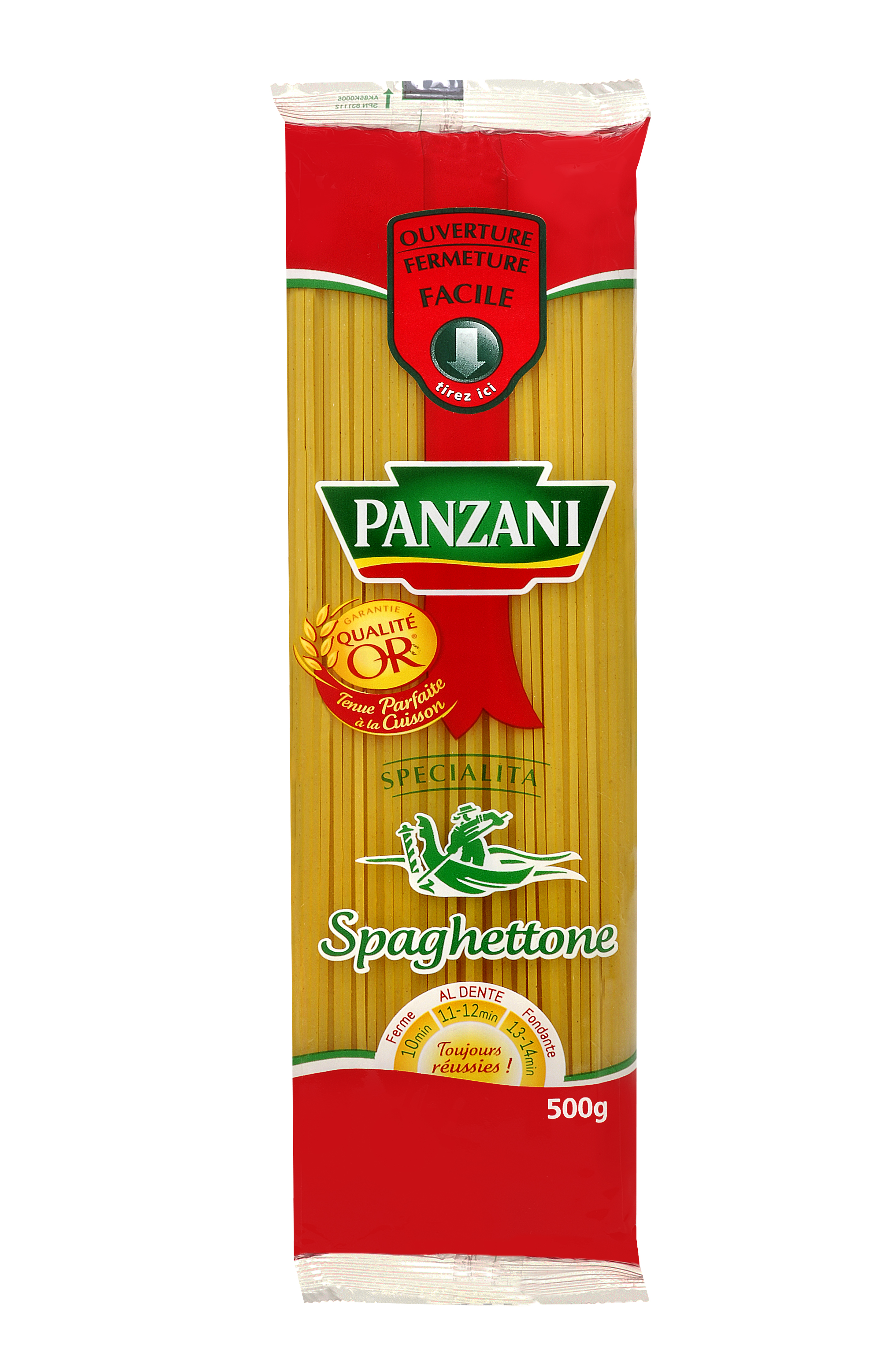 Pâtes alimentaires de qualité supérieure Ce Spaghetti moins classique est très apprécié des Italiens pour sa consistance épaisse et sa forme typique. Le Spaghettone Panzani est particulièrement savoureux avec des sauces légères ou piquantes qui relèveront toutes vos recettes