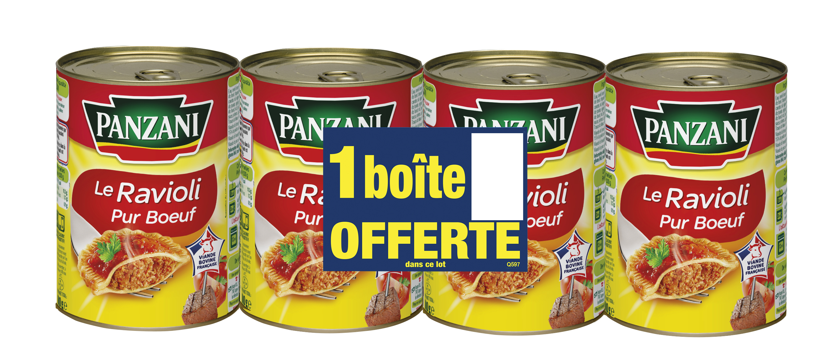 Eau, ravioli (semoule de BLE dur, eau, viande de boeuf, chapelure (farine de BLE, sel, levure), carottes, sel, oignons déshydratés 0,05%), triple concentré de tomate 6%, viande de bœuf, oignons réhydratés 3%, carottes, amidon modifié de maïs, huile de colza 0,6%, sel, sucre, arôme. Traces de blanc d'OEUF Viande de bœuf mise en oeuvre : 7,5% du poids net total.