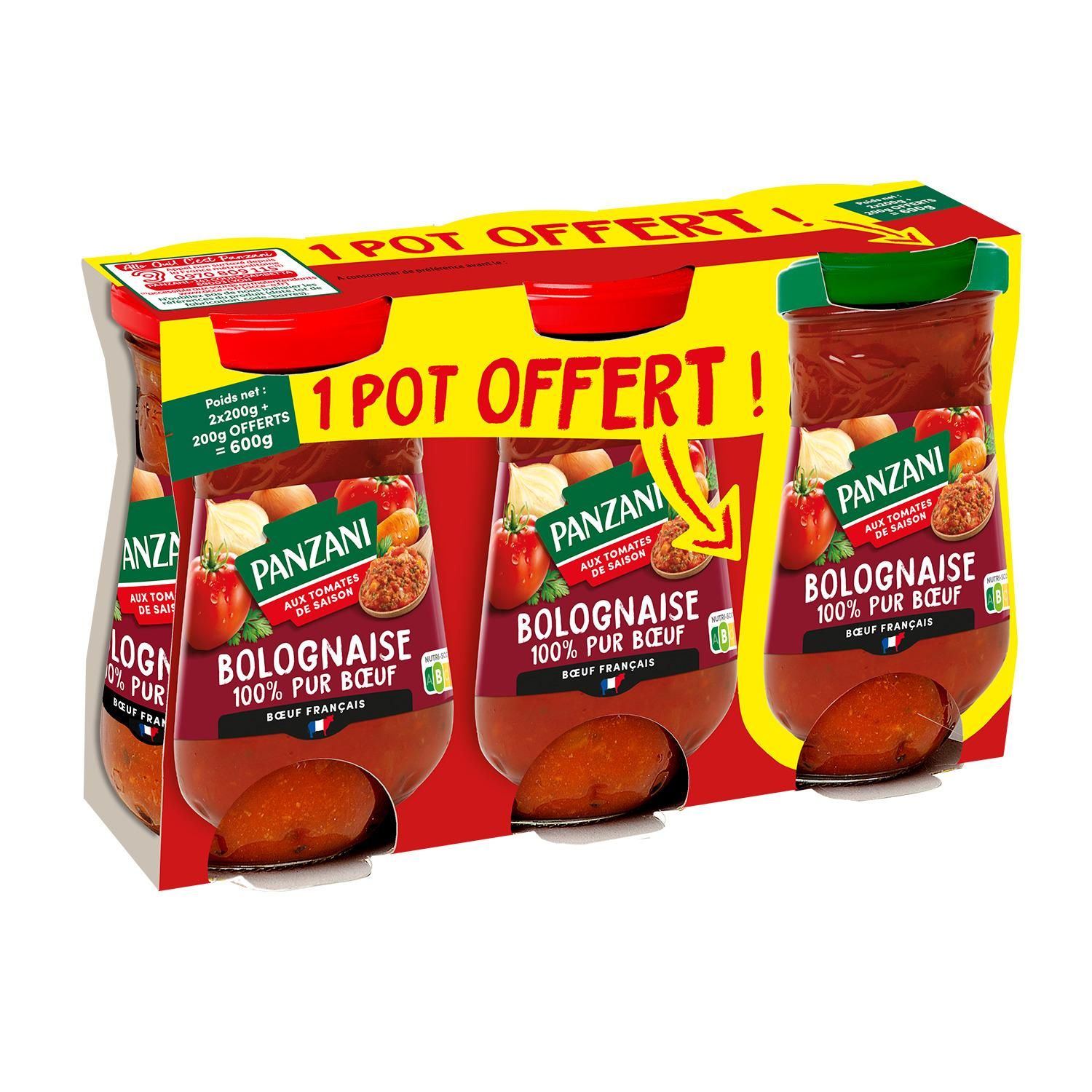 Ingrédients : pulpe de tomates et concentré de tomates (55%), bœuf 18%, eau, légumes frais 9% (carottes, oignons), sel, sucre, amidon transformé de maïs, persil, arômes, huile de tournesol, ail, poivre.