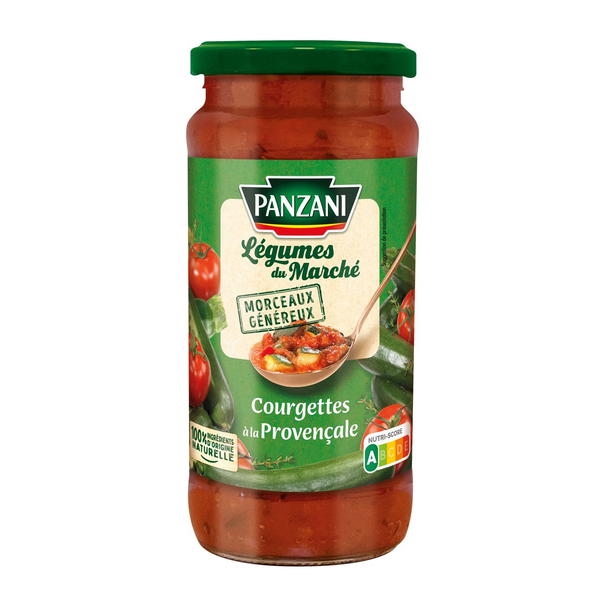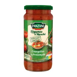 Pulpe de tomates avec morceaux et purée de tomates 64%, courgettes 24%, oignons, sucre, huile d'olive vierge, herbes de provence 1,2% (dont 0,1% de thym), sel, amidon, ail, jus de citron concentré.
