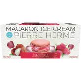 Biscuit Macaron de couleur rose à base de meringue suisse (46%): sucre, AMANDES (13,8%), BLANC D OEUF (8,8%), colorant (acide carminique). Sorbet à base de framboise (27%): Pulpe de framboises (17,8%) sucre, eau, dextrose, jus de citron , protéines de LAIT, gélatine, stabilisants (gomme de guar, pectines,carraghénanes). Sorbet à base de Litchi et de rose, aromatisé (27%): Pulpe de Litchi (16,3%), eau, sucre, dextrose, sirop à la rose aromatisé [sucre, eau, arôme naturel, acidifiant (acide citrique), colorants (anthocyanes). Contient de l'extrait de pétales de rose], protéine de LAIT, gélatine, stabilisants (gomme guar, pectines, carraghénanes), arôme naturel des rose.