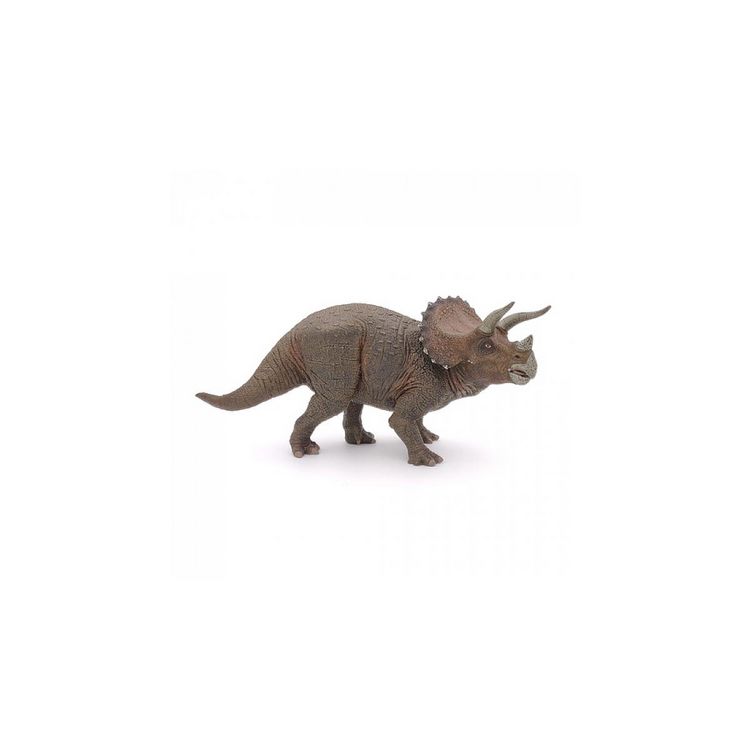 Le Tricératops est facilement reconnaissable avec sa grande collerette osseuse. PAPO sest attaché à reproduire toutes ses particularités : ses trois cornes, de grandes pattes et un museau doté dun bec dit « de perroquet » qui lui permettait de pouvoir facilement arracher herbes et feuilles. Ce quadr