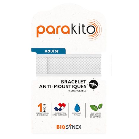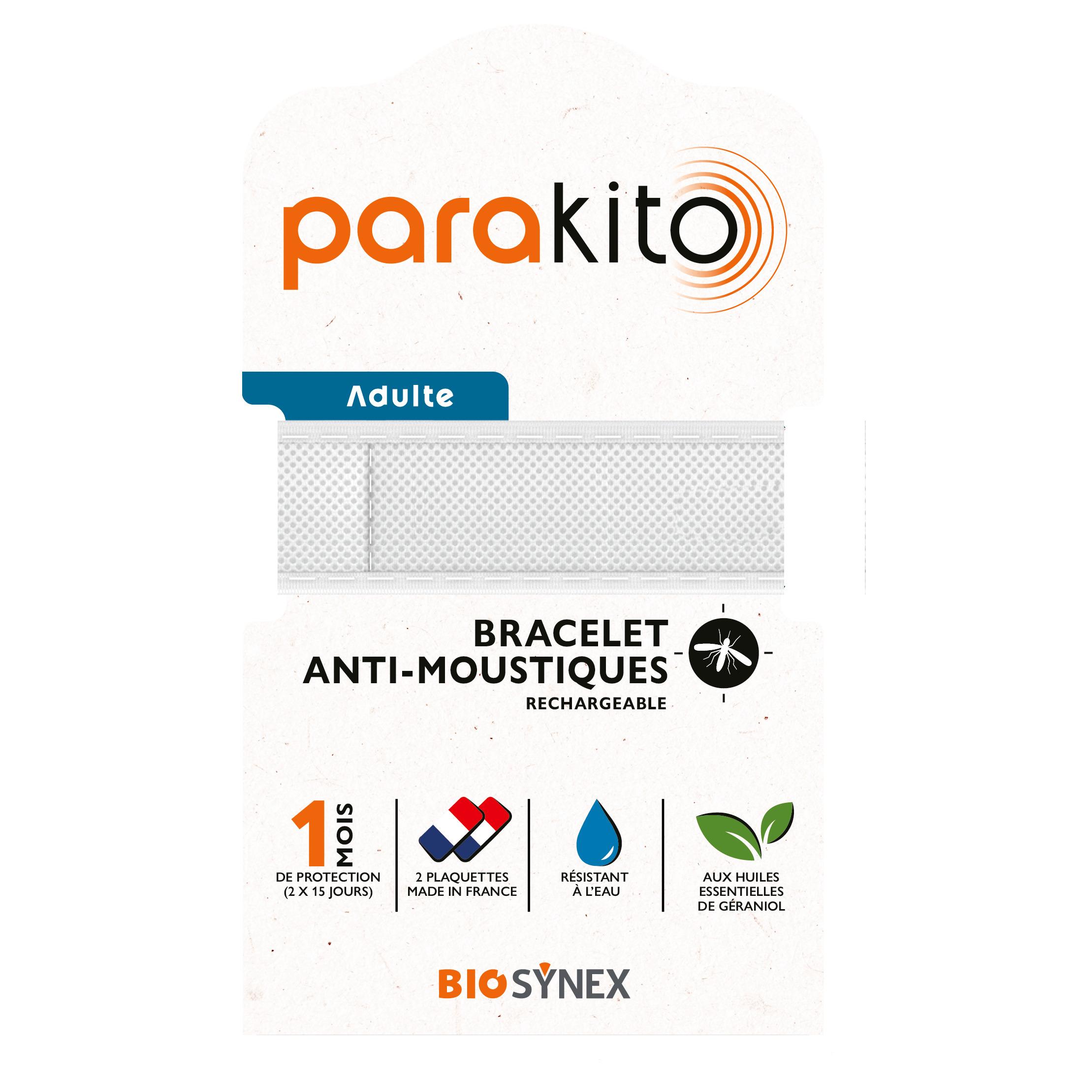 Bracelet Anti-moustiques Rechargeable. La Technologie Brevetée DiffuControl-System™ des plaquettes Parakito® permet de garantir une protection contre les Moustiques.