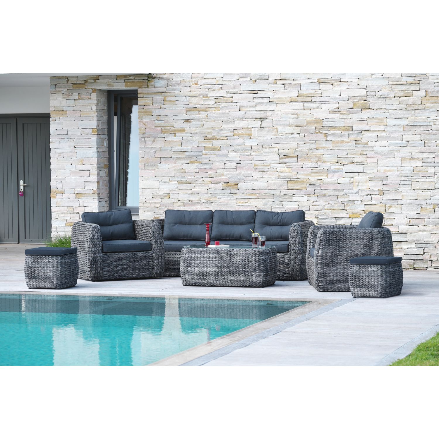 Profitez des premiers rayons de soleil avec le salon bas de jardin BAHAMAS S3 en aluminium et en résine imitation bananier coloris gris anthracite. Pouvant accueillir jusqu'à 7 personnes, il est composé d'une table basse de jardin avec un plateau en verre facilement nettoyable, d'1 banquette de jardin 3 places, de 2 fauteuils de jardin et de 2 poufs de jardin. Très confortable, le salon bas de jardin Bahamas vous transportera directement dans un coin paradisiaque.