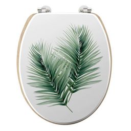 Informations Techniques : Dimensions : L. 46 x l. 37,5 x H. 5,5 cm Matières : MDF & Métal Spécificités : Pratique & Tendance Abattant WC déco Avec charnières en métal Motif imprimé Design feuilles Poids : 2,84 kg Couleur : Blanc