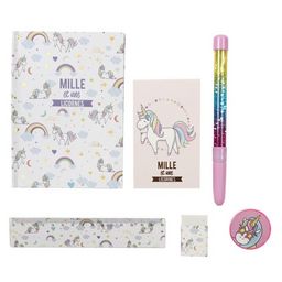 Contient 1 Cahier, 1 Règle, 1 Gomme, 1 Stylo & 1 Bloc Note