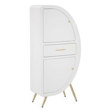 Informations Techniques : Dimensions : L. 60 x l. 32 x H. 133 cm Tiroir : L. 44,5 x l. 27x H. 11cm Matières : MDF & Métal Spécificités : Pratique & Originale Armoire Design Avec 2 portes et 1 tiroir Finitions dorées Pieds à assembler soi-même Poids : 19,5 kg Couleur : Blanc & Or
