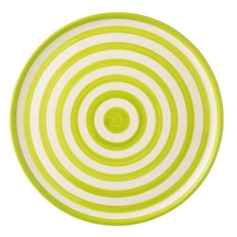 Informations Techniques : Dimensions : D. 34 x H. 2,5 cm Matière : 100% Céramique Spécificités : Pratique & Utile Assiette de présentation ronde Motifs à rayures Compatibilités : Four, lave-vaisselle et micro-ondes Poids : 1,23 kg Couleur : Vert & Blanc