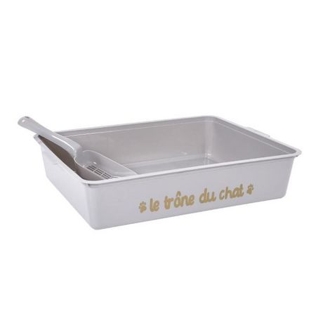 Informations Techniques : Dimensions : L. 42 x l. 31,5 x H. 9 cm Matière : 100% Plastique Spécificités : Pratique & Utile Bac à litière pour chat Avec une pelle Inscription Le trône du chat Forme rectangulaire Poids : 0,29 kg Couleur : Gris