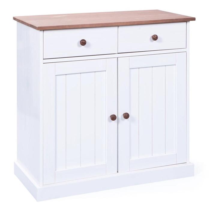 Informations Techniques : Dimensions : L. 90 x P. 45 x H. 86 cm Matières : Pin massif & Sépia Spécificités : Pratique & Élégant Style campagnard Fabriquée à partir de bois de plantation renouvelé Vernis blanc étanche Equipé de 2 portes et deux tiroirs montés sur des rails coulissants Livré démonté