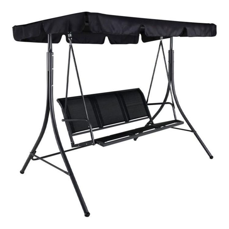 Informations Techniques : Dimensions : L. 204 x l. 130 x H. 163 cm Assise : L. 132 x l. 44 cm Matières : 70% PVC & 30% Polyester Spécificités : Élégante & Pratique Balancelle d'extérieur 3 places Avec toit Résistante à l'eau Traitement anti-UV Poids : 27,5 kg Couleur : Noir