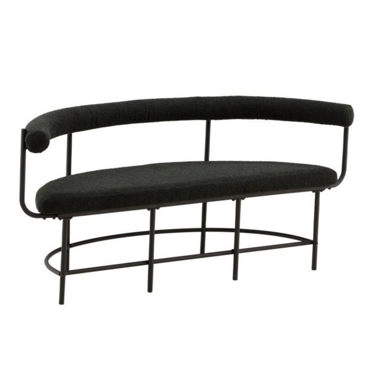 Informations Techniques : Dimensions : L. 165 x l. 51 x H. 75 cm Assise : H. 47 cm Matières : Revêtement : Tissu Structure & Piètement : Acier Spécificités : Tendance & Élégant Banc design arrondi Tissu bouclé Poids max supporté : 150 kg Poids : 15,5 kg Couleur : Noir