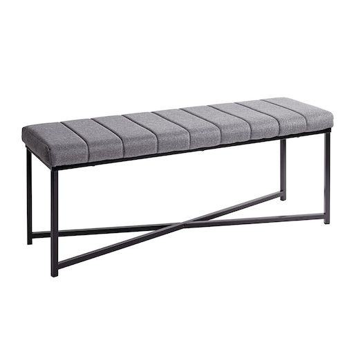 Informations Techniques : Dimensions : L. 118 x l. 38 x H. 47 cm Matières : Tissu, MDF & Acier Spécificités : Pratique & Élégant Banc design Assise rembourrée Poids max supporté : 90 kg Poids : 10,5 kg Couleur : Gris & Noir