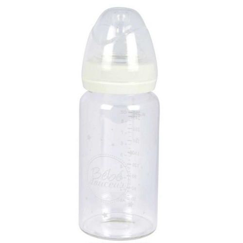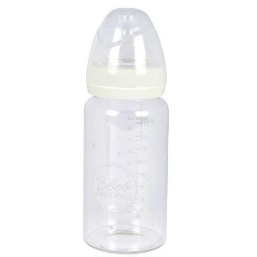 Informations Techniques : Matières : Verre & Silicone Spécificités : Pratique & Utile Biberon pour Bébé Col Large en Verre Tétine avec Débit Variable en Silicone Contenance : 250 ml Poids : 0,188 kg Couleur : Transparent