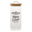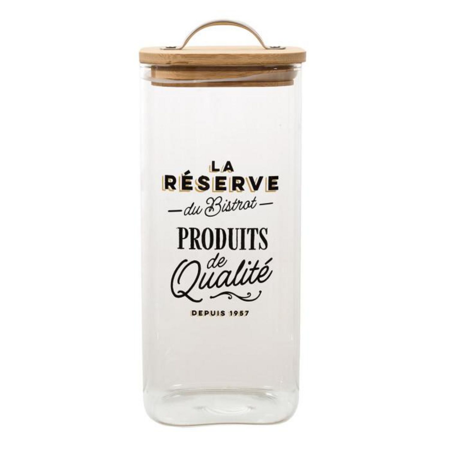 Informations Techniques : Dimensions : L. 10,2 x l. 9 x H. 22,6 cm Matières : Verre, Bambou & Acier Spécificités : Pratique & Utile Bocal de conservation Couvercle en bambou Avec poignée en métal Inscription la réserve du bistrot Capacité : 1,5 L Poids : 0,45 kg Couleur : Transparent