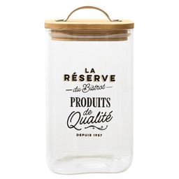 Informations Techniques : Dimensions : L. 10,2 x l. 9 x H. 16,9 cm Matières : Verre, Bambou & Acier Spécificités : Pratique & Utile Bocal de conservation Couvercle en bambou Avec poignée en métal Inscription la réserve du bistrot Capacité : 1 L Poids : 0,4 kg Couleur : Transparent