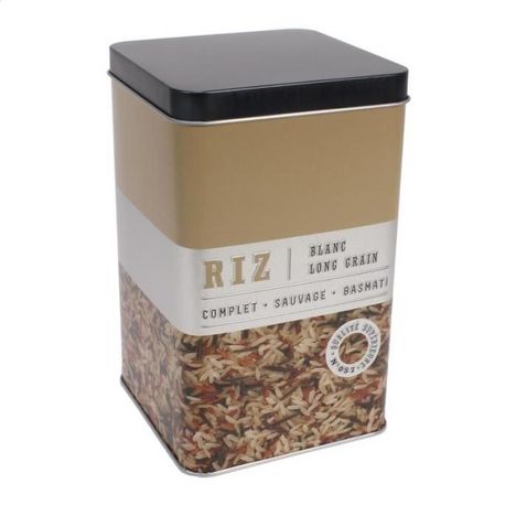 Informations Techniques : Dimensions : L. 11 x l. 11 x H. 18 cm Matières : Métal & Fer Spécificités : Pratique & Utile Boîte à Riz Forme Carrée Style Vintage & Rétro Poids : 0,18 kg Couleur : Beige & Noir