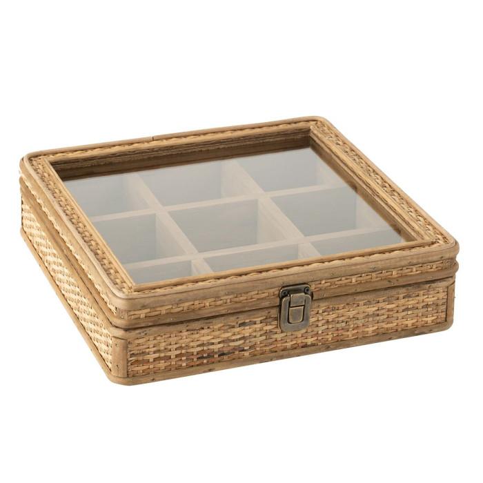 Informations Techniques : Dimensions : L. 31 x l. 30 x H. 8 cm Matière : Roseau, Rotin, Bambou & Verre Spécificités : Pratique & Utile Boite à thé 9 compartiments Forme carrée Vendue à l'unité Poids : 1,55 kg Couleur : Naturel
