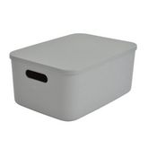 Informations Techniques : Dimensions : L. 35,5 x l. 25,5 x H. 16 cm Matière : Plastique Spécificités : Pratique & Utile Boite de rangement Avec couvercle et poignées Design uni opaque Forme rectangulaire Capacité : 10,5 L Poids : 0,44 kg Couleur : Gris